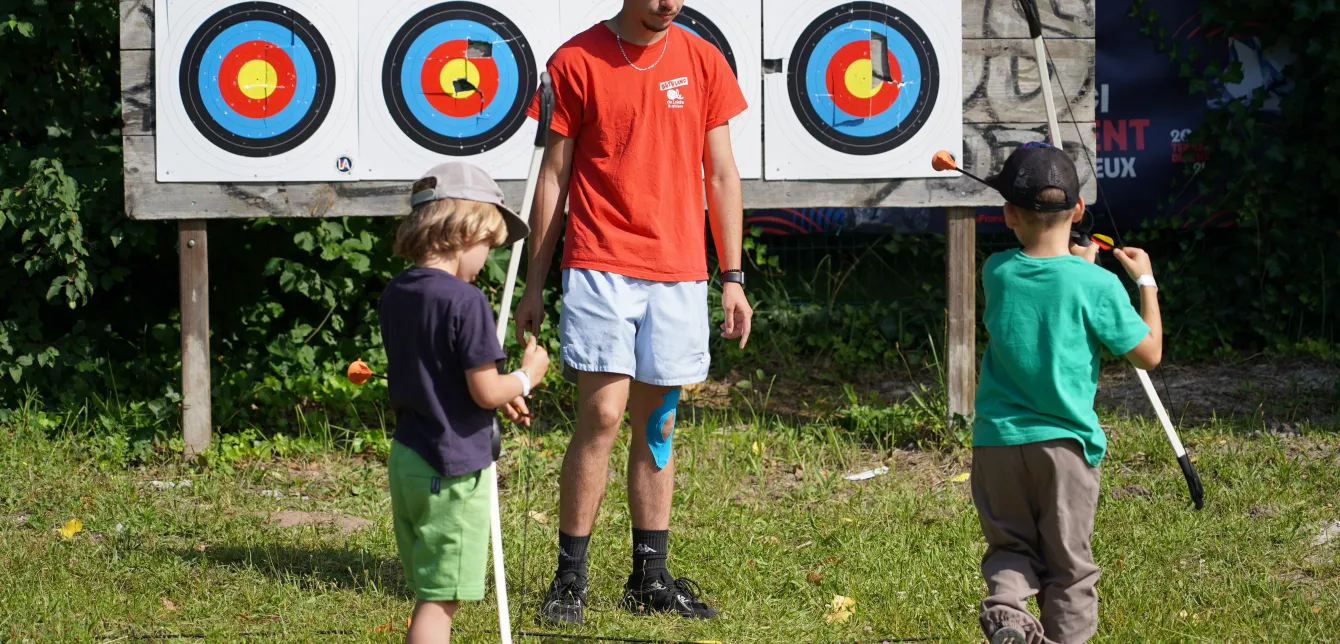 « C’est un défouloir, et en même temps, ce sport demande de l’attention, de la concentration », explique Mike. Des qualités qui sont aussi requises à l’atelier tir à l’arc, installé à seulement quelques mètres de là. Les apprentis archers apprennent d’abord les règles de sécurité. Si les premiers essais pour appréhender l’arc, tendre la corde avec la flèche à ventouse et viser ne sont pas évidents, le cœur de cible est atteint : l’enthousiasme des enfants est bien là.
