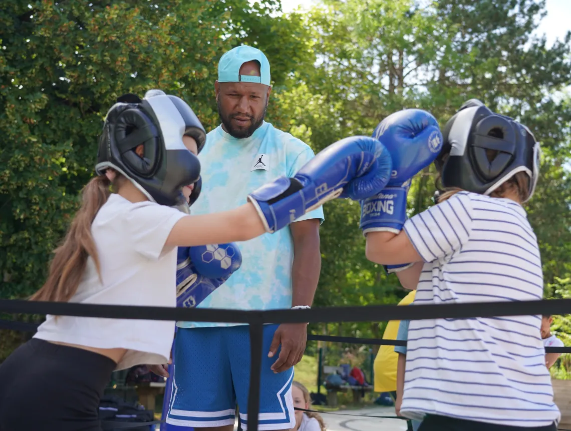 L’évasion sportive se poursuit sur le terrain multisports. Juliette et Mila font leurs premiers pas de boxeuses, sous la houlette de Mike, éducateur sportif et médiateur de l’île de loisirs. Avec une dizaine d’autres petits Franciliens, elles s’échauffent et se familiarisent aux coups comme à la garde. Après s’être équipées de gants et d’un casque, place aux premiers combats. Une minute pendant laquelle les enfants donnent de la voix.