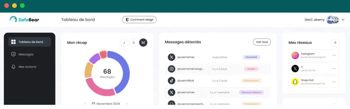 En quelques clics sur l’application SafeBear, un dossier de preuves certifiées, horodatées et automatiquement récoltées depuis un mois est transféré à l’officier de police judiciaire. Pour 4 euros par mois, SafeBear se connecte aux réseaux sociaux de ses utilisateurs, identifie les contenus à risque et construit un dossier de preuves fiable, transmissible aux autorités, aux établissements ou aux plateformes.