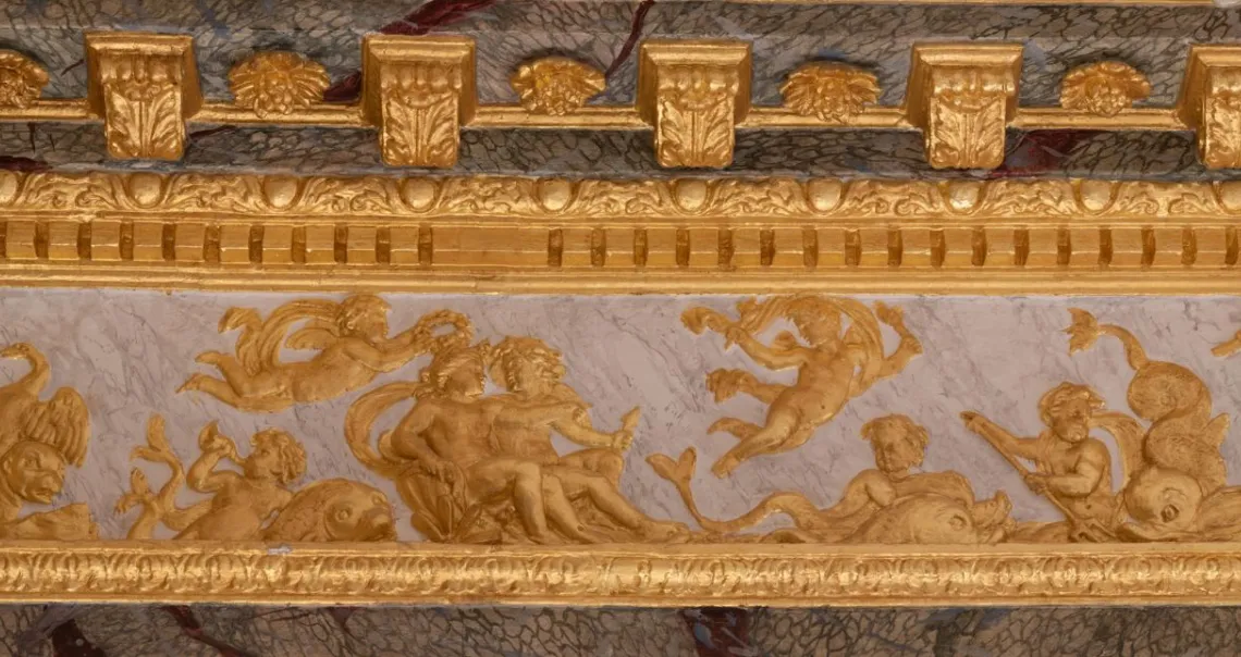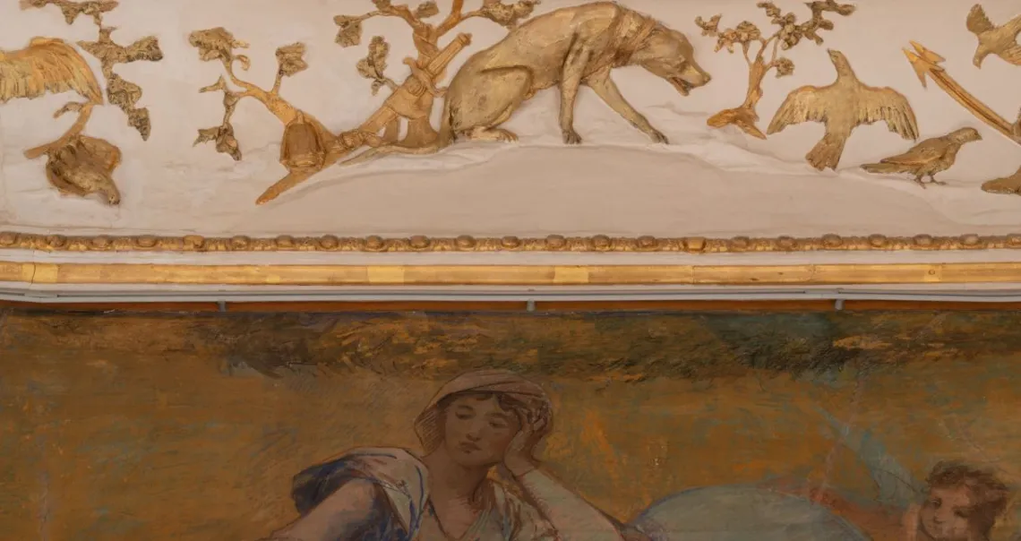 Ils étaient plus riches dans le grand salon qui n’a conservé que sa corniche ondulante représentant des scènes de chasse.