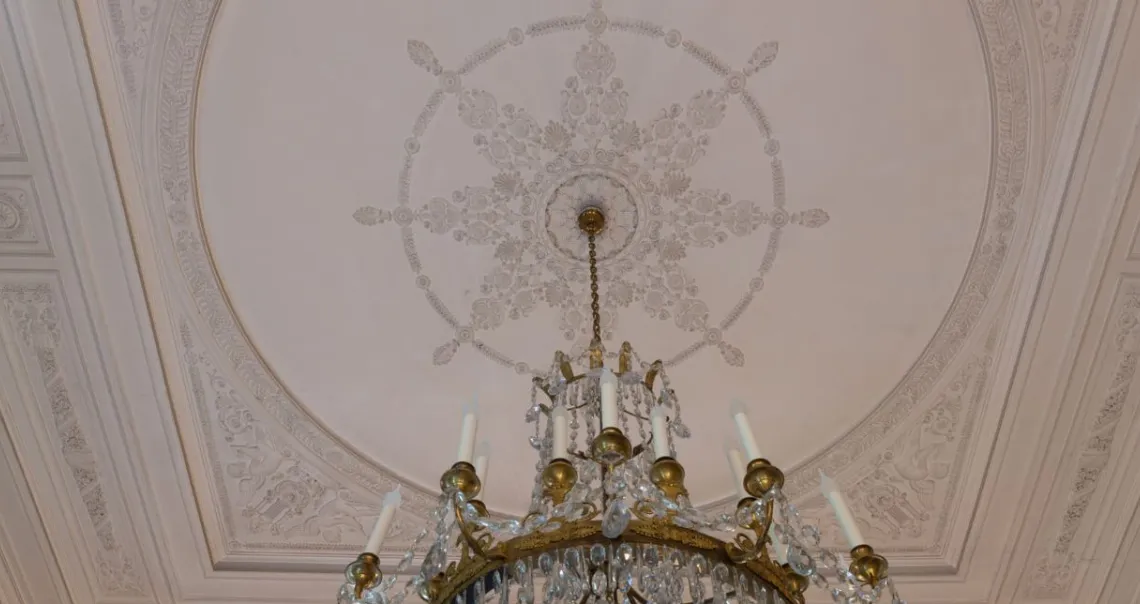 Par contraste, les décors intérieurs conservés nous montrent toute la richesse des espaces de réception situés au rez-de-chaussée, surélevé au-dessus d’un niveau de service. Le vestibule, très sobre, reste dans l’esprit des élévations extérieures et dessert une salle à manger où des colonnes doriques jumelées se détachent sur un placage de loupe d’orme, ainsi qu’une salle de billard et un salon doré, dont les murs présentent un lambris blanc rechampi d’or comportant des pilastres doriques et corinthiens, et qui accueillait un cycle des Quatre saisons peint par Gérard. Des carreaux de marbre insérés dans le parquet marquent l’emplacement du billard.
