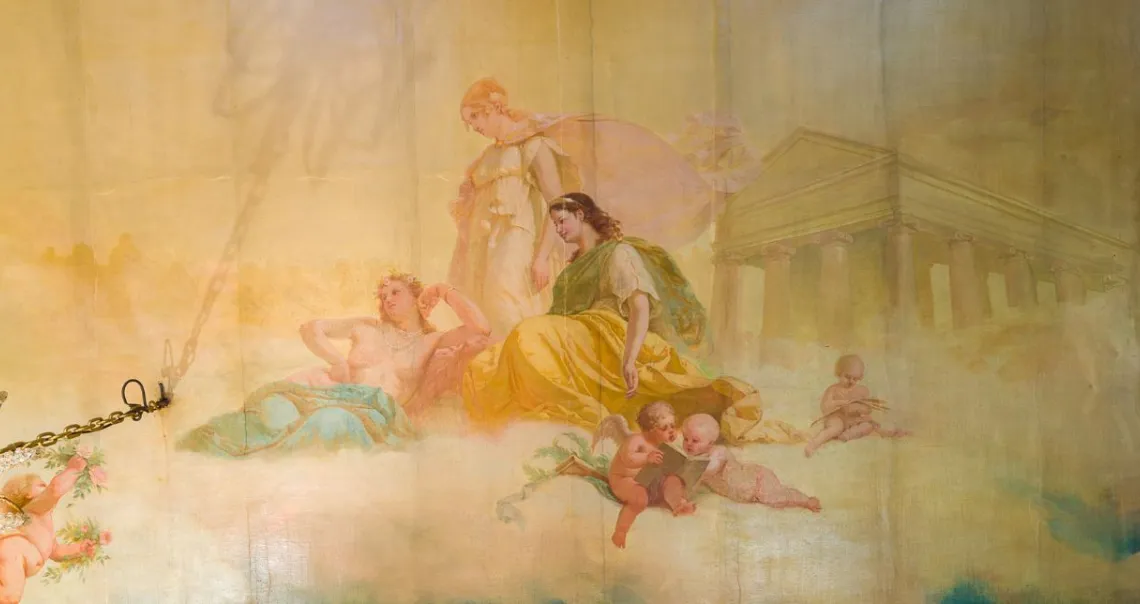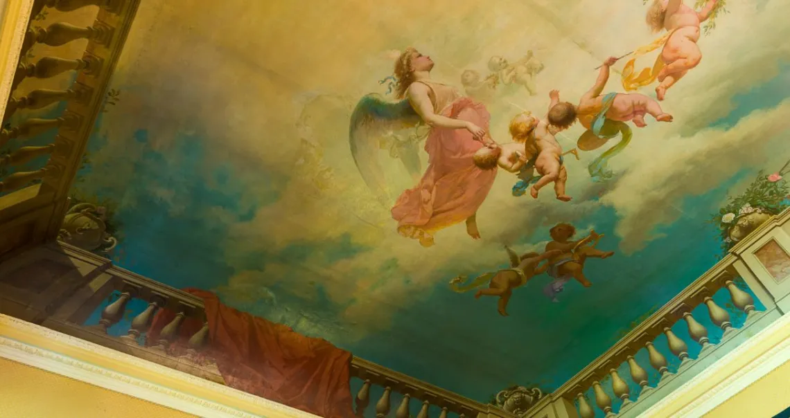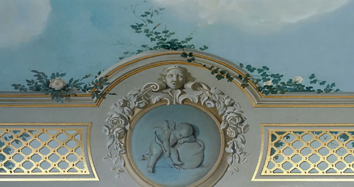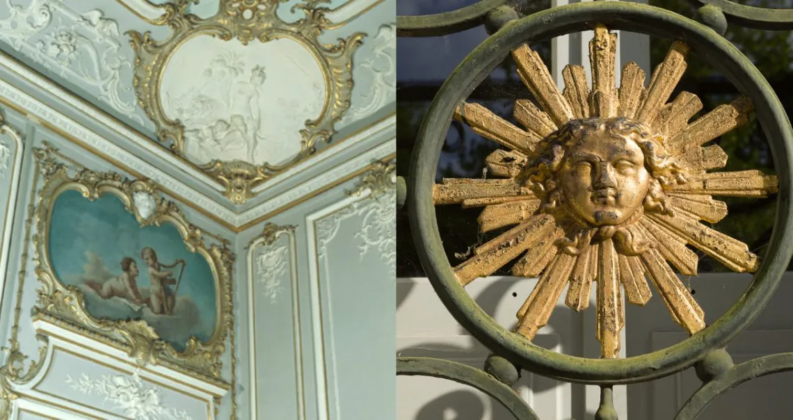 Le grand salon s’ouvre par trois baies sur la loggia qui a été depuis vitrée et transformée en jardin d’hiver. Le plafond est orné d’une vaste peinture murale en trompe-l’œil sur toile marouflée. Bordée d’une fausse balustrade avec draperies, elle s’ouvre sur le ciel peuplé de figures mythologiques. De part et d’autre, du côté de la cuisine – qui est une adjonction du XXe siècle, celle d’origine étant au sous-sol – se trouve une grande salle à manger et son office et de l’autre un petit salon de style rocaille. En face, l’actuelle petite salle à manger servait de bureau à l’origine. Il y avait une salle de billard à l’étage.