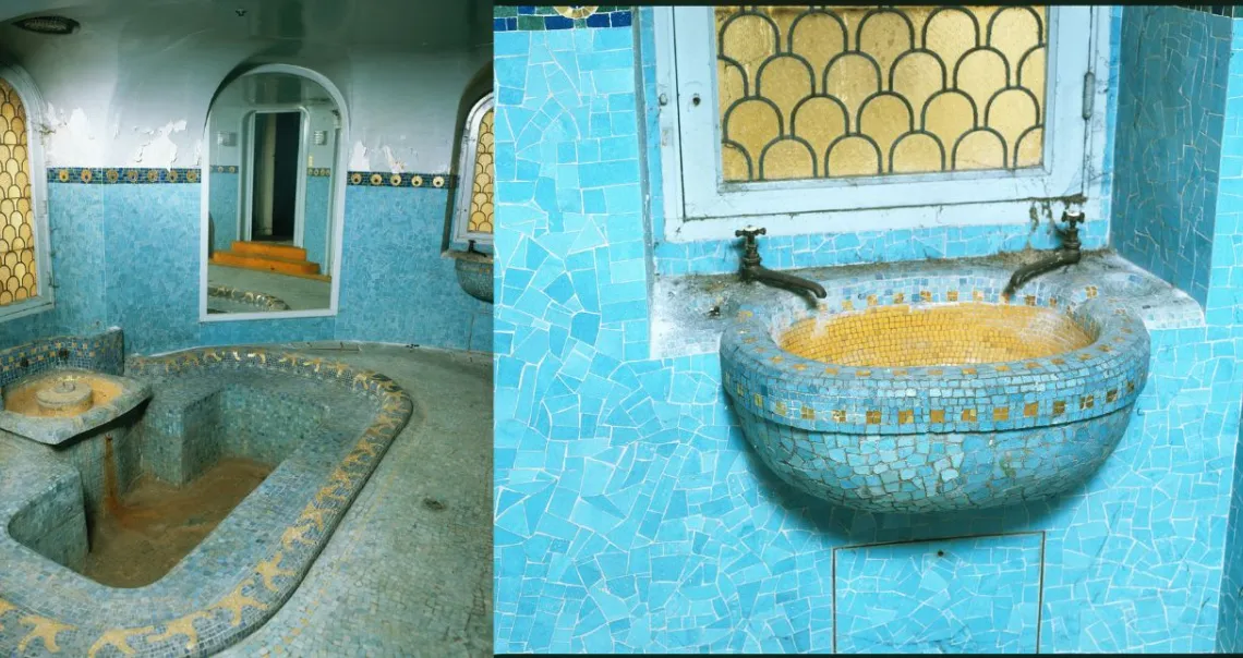 Au rez-de-chaussée, une salle de bains, couverte de mosaïques de faïence turquoise et dorée, avec sa baignoire percée dans le sol et un petit jet d’eau, évoque les bains mauresques. Au-dessus, on accède par un escalier étroit à trois pièces intimes et à la salle panoramique, ouverte sur le paysage par de larges baies horizontales.