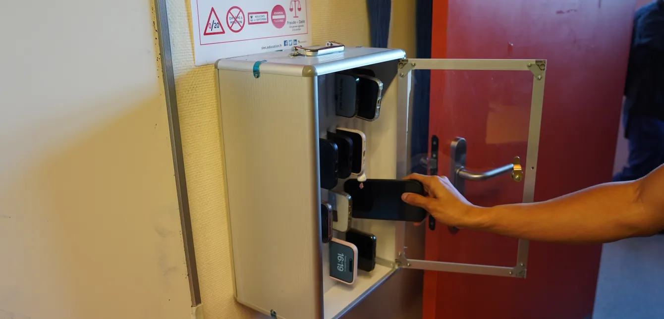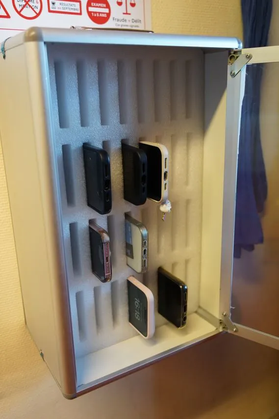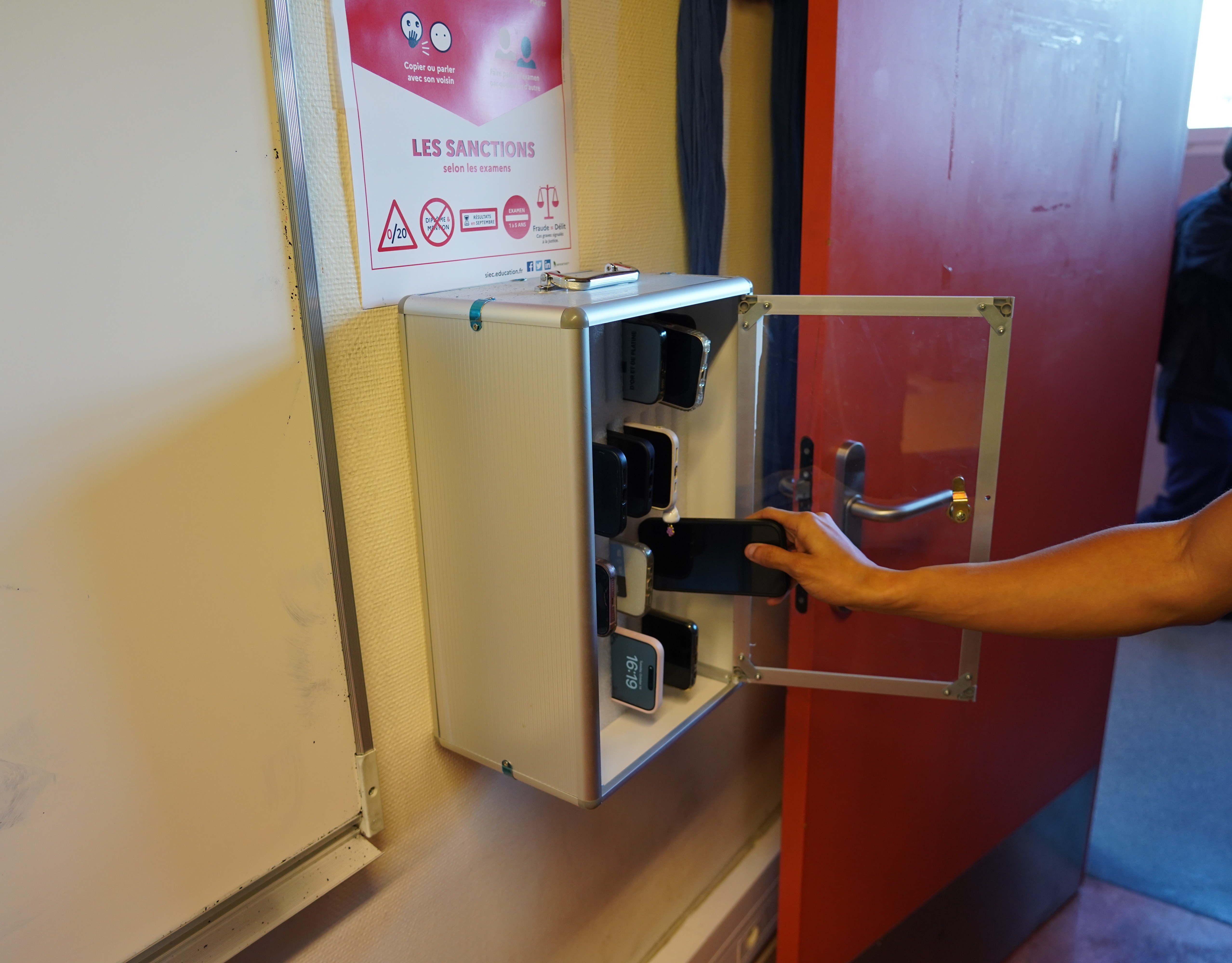 Dans la salle de classe, à côté du tableau, une sorte de boîte aux lettres vitrée est fixée au mur. Celle-ci est garnie d’une mousse blanche alvéolée ; les lycéens y glissent leurs téléphones. Quand tout le monde a pris place, le professeur fait l’inventaire : 24 téléphones, autant que d’élèves présents. Le compte est bon.