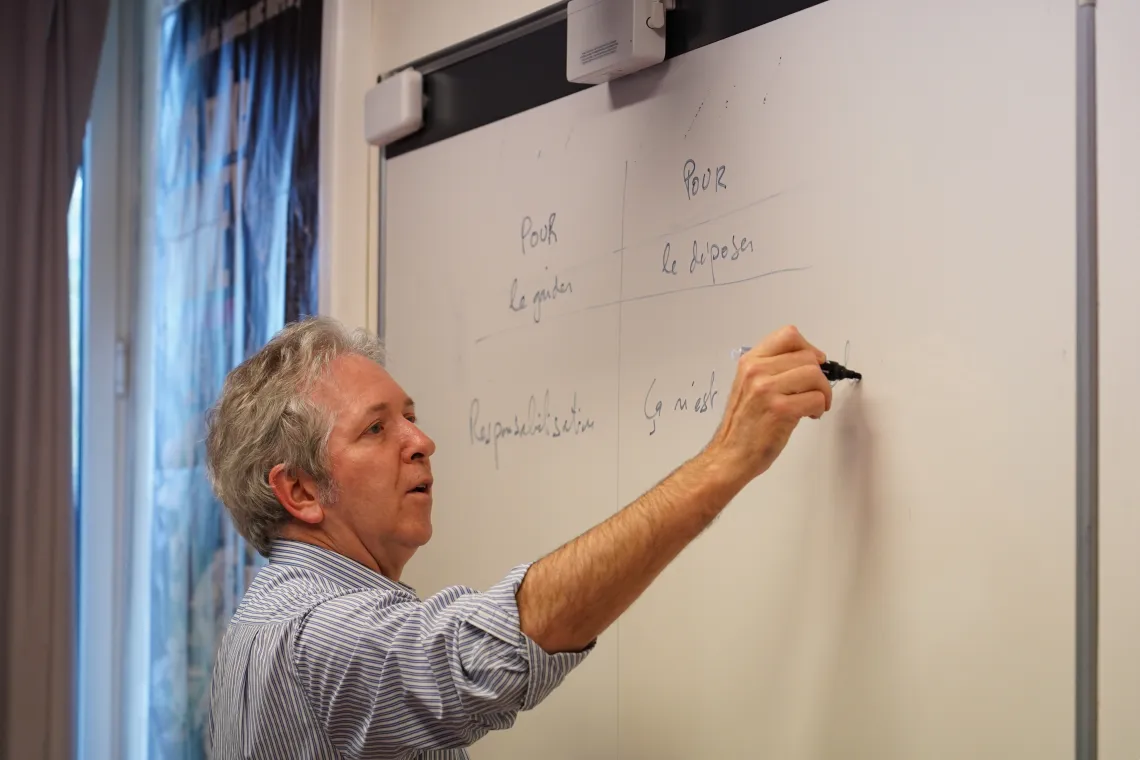 Le professeur note les arguments dans deux colonnes au tableau tout en commentant : « Le problème, c’est de s’assurer que tout le monde est assez responsable pour ne pas céder à la tentation. Si un élève sort son téléphone, les autres suivront. »